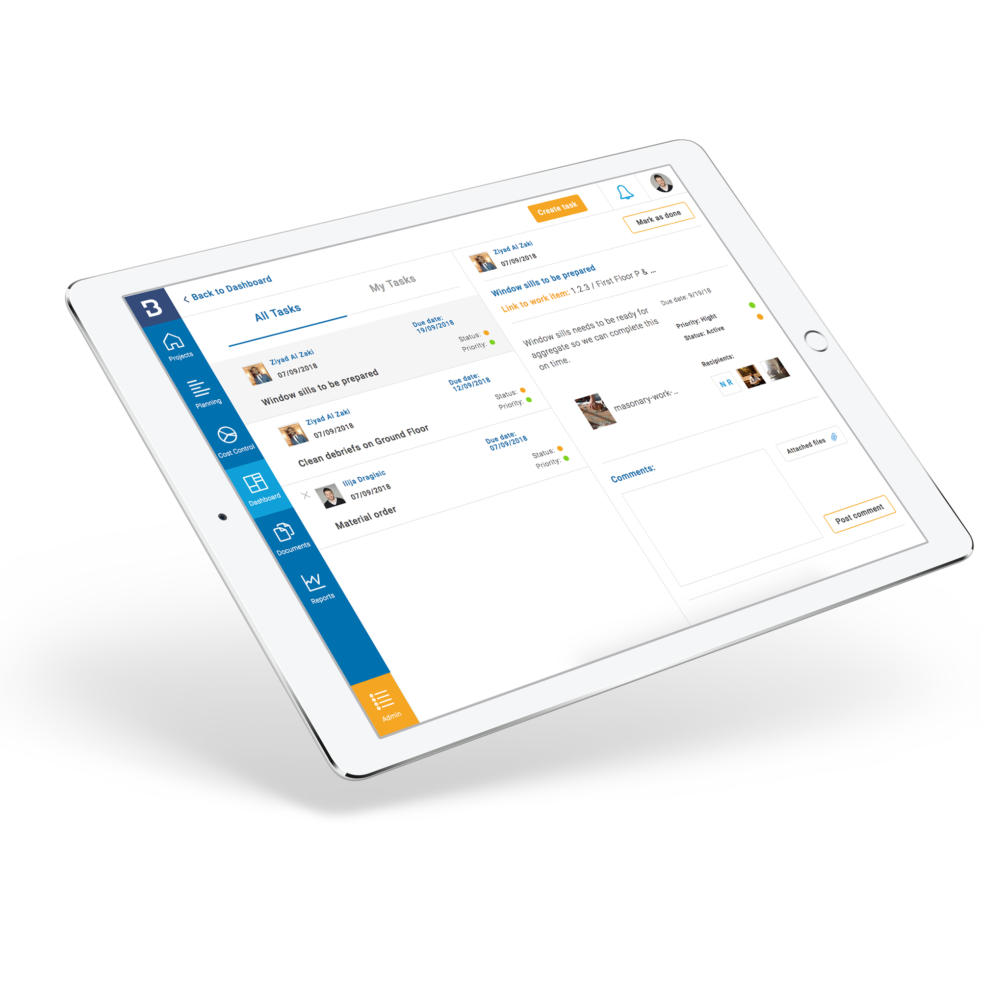 Using tasks feature in Buildcon helps you track requests for change or requests for information. With this feature you are tracking what needs to be done, who is responsible for delivering it, and when is the due date. If needed, every task can have attachments like drawings in DWG or PDF, documents regarding materials or photos, as well as Excel or Word files. Person responsible for execution of a task can mark it as finished which triggers instant notification to the task owner so control can be performed immediately.